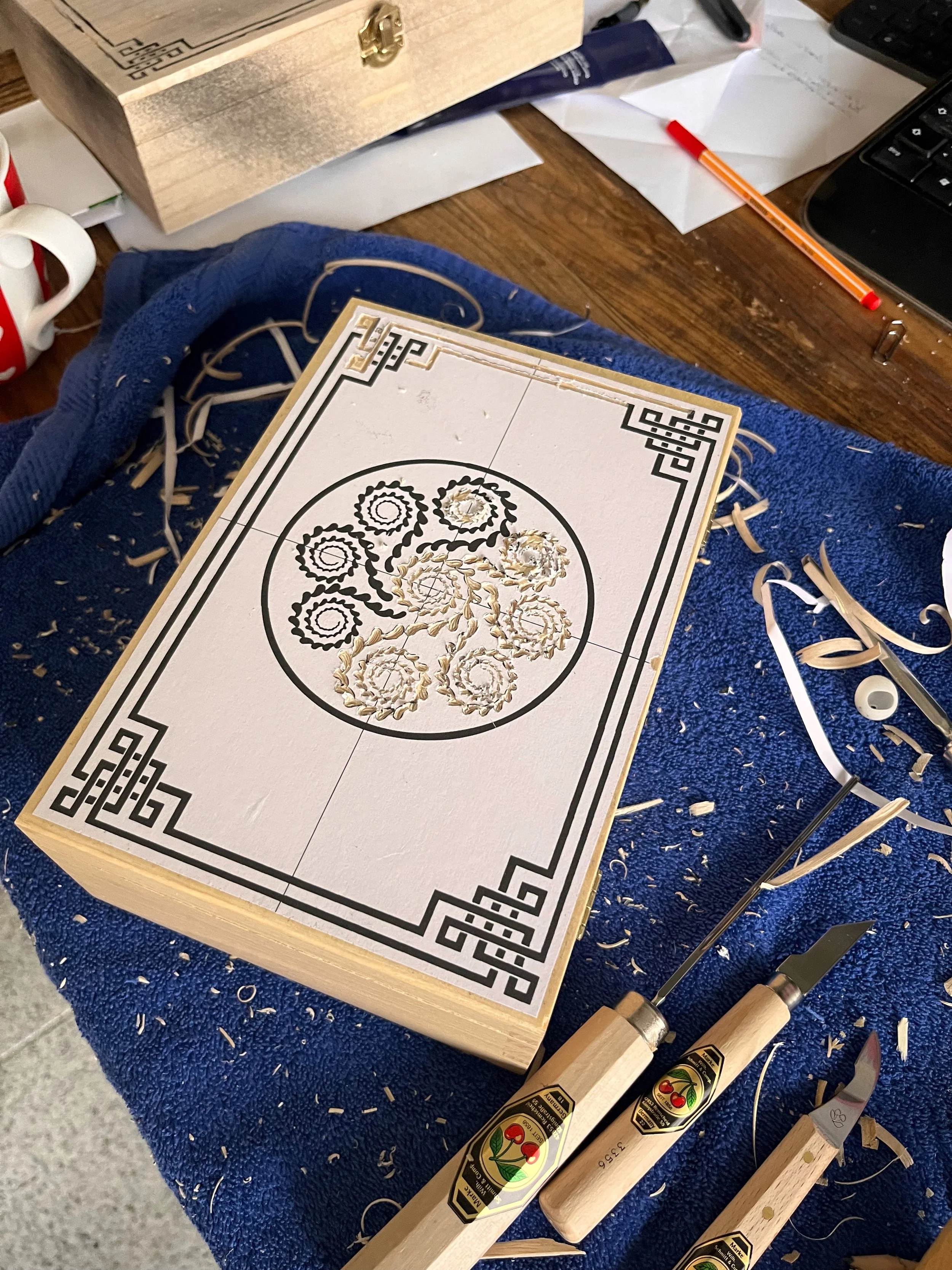 As a homage to my partner’s bachelor thesis, a hand-carved chest was created that looks like an artifact from the fantasy city of Tashbaan. Inspired by Babylonian patterns, equipped with a self-designed city seal and a complete wax seal set, the project combines digital fabrication, traditional craftsmanship, and artistic research. An object that demonstrates how fantasy and reality can merge.