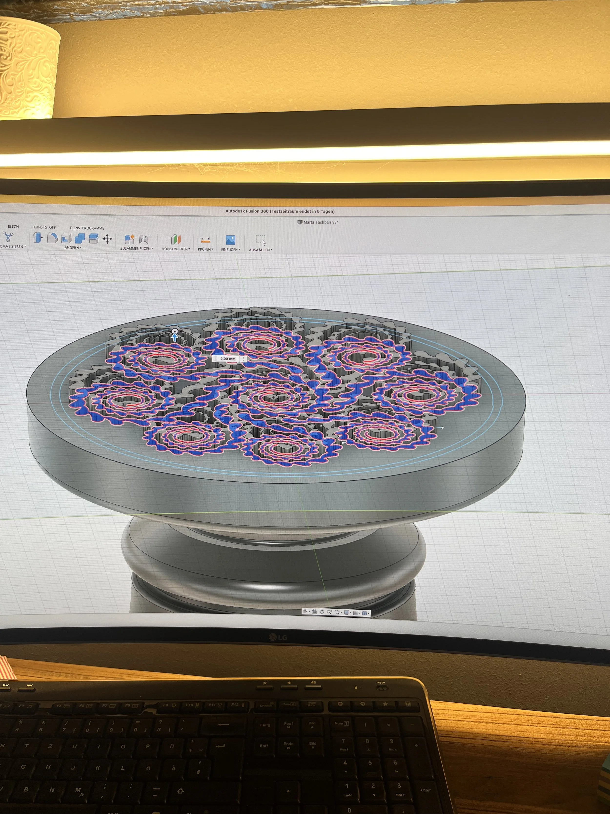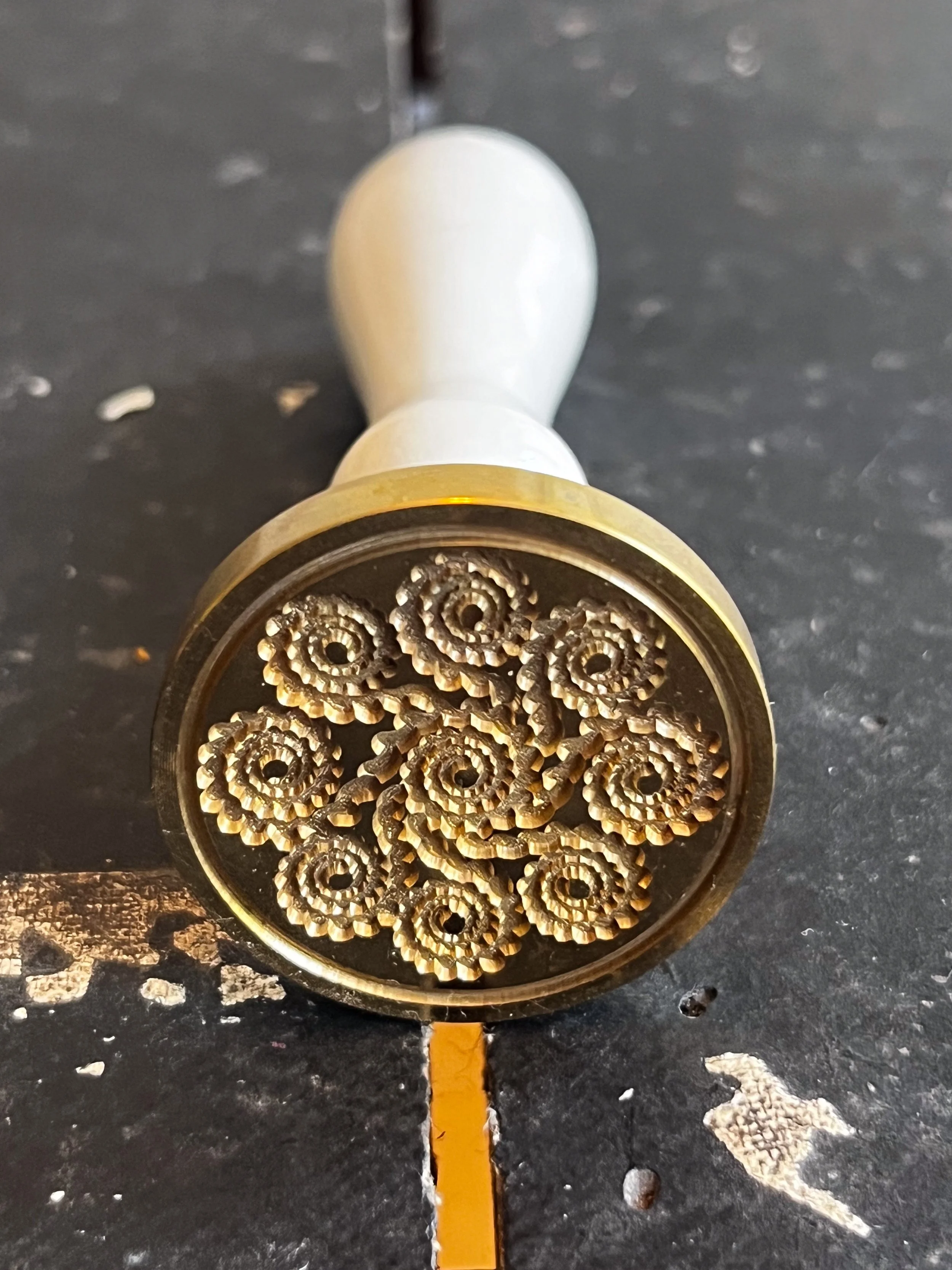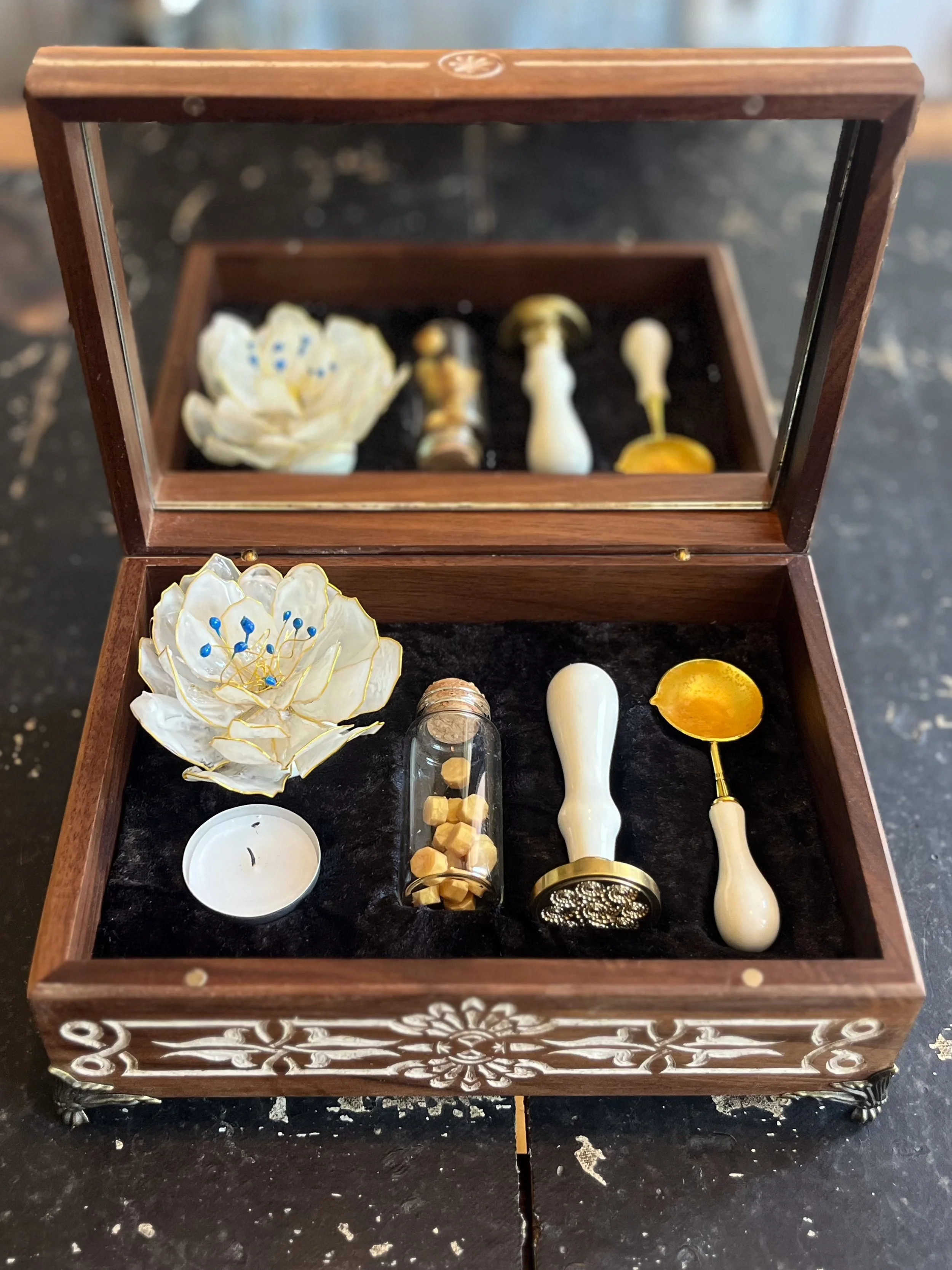 Inside, a complete wax seal set is concealed: carefully shaped padding holds the individual pieces securely, with a custom-designed wax stamp at its center. This stamp was modeled using Fusion 360 and then produced on a CNC machine. The seal design — also created by me — combines the city’s logo with mathematical ornamentation. The ensemble is complemented by an artificial flower, which I crafted in elaborate handwork from copper wire and UV resin.