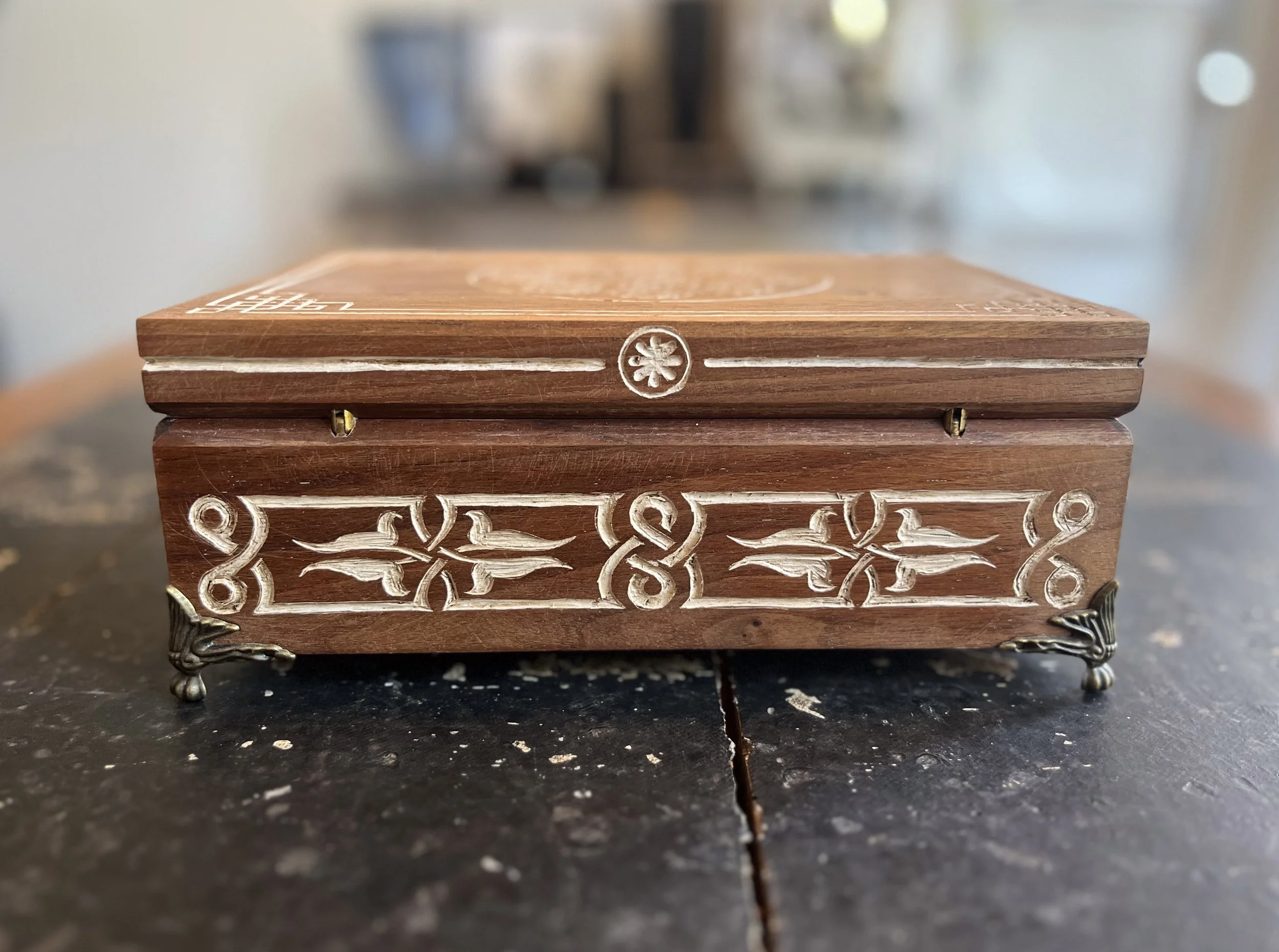 The result is a handcrafted chest that gives the impression of originating directly from the city of Tashbaan. On the outside are delicate carvings inspired by Babylonian patterns, which, through intentional patination, acquire an aged, almost archaeological appearance. On the top, the custom-designed city seal stands out, its geometric lines reminiscent of the fractal structures of the city’s layout.