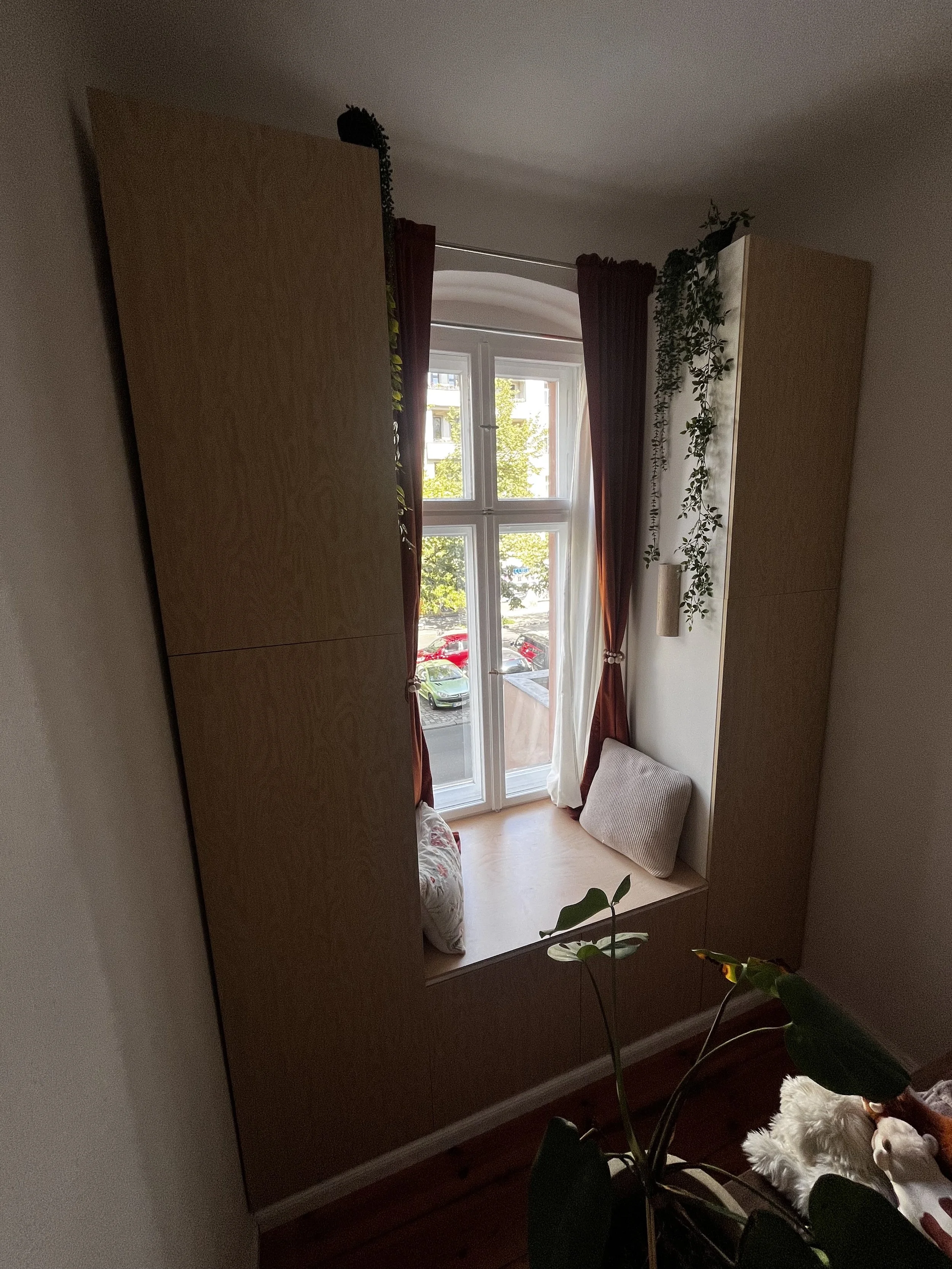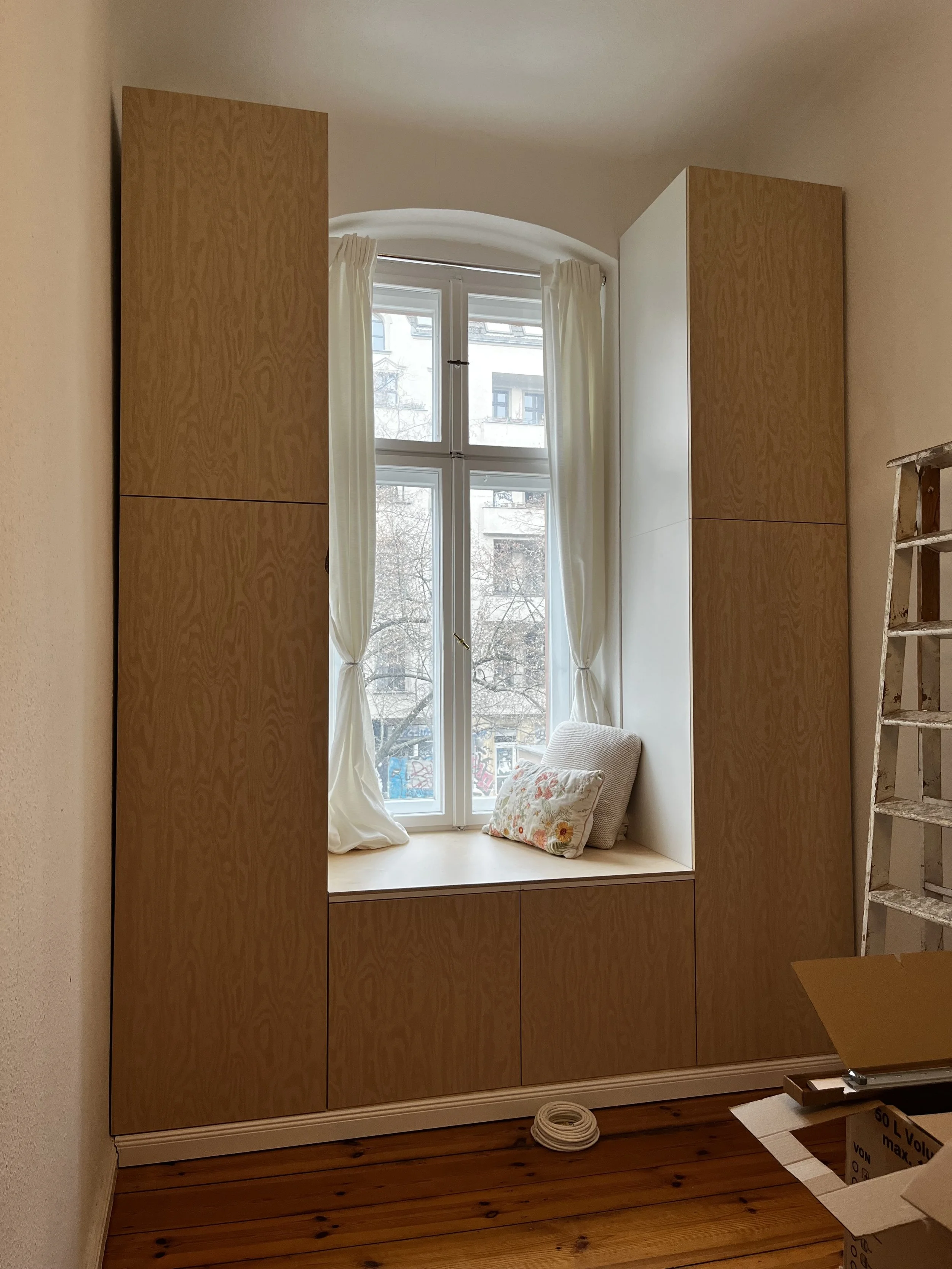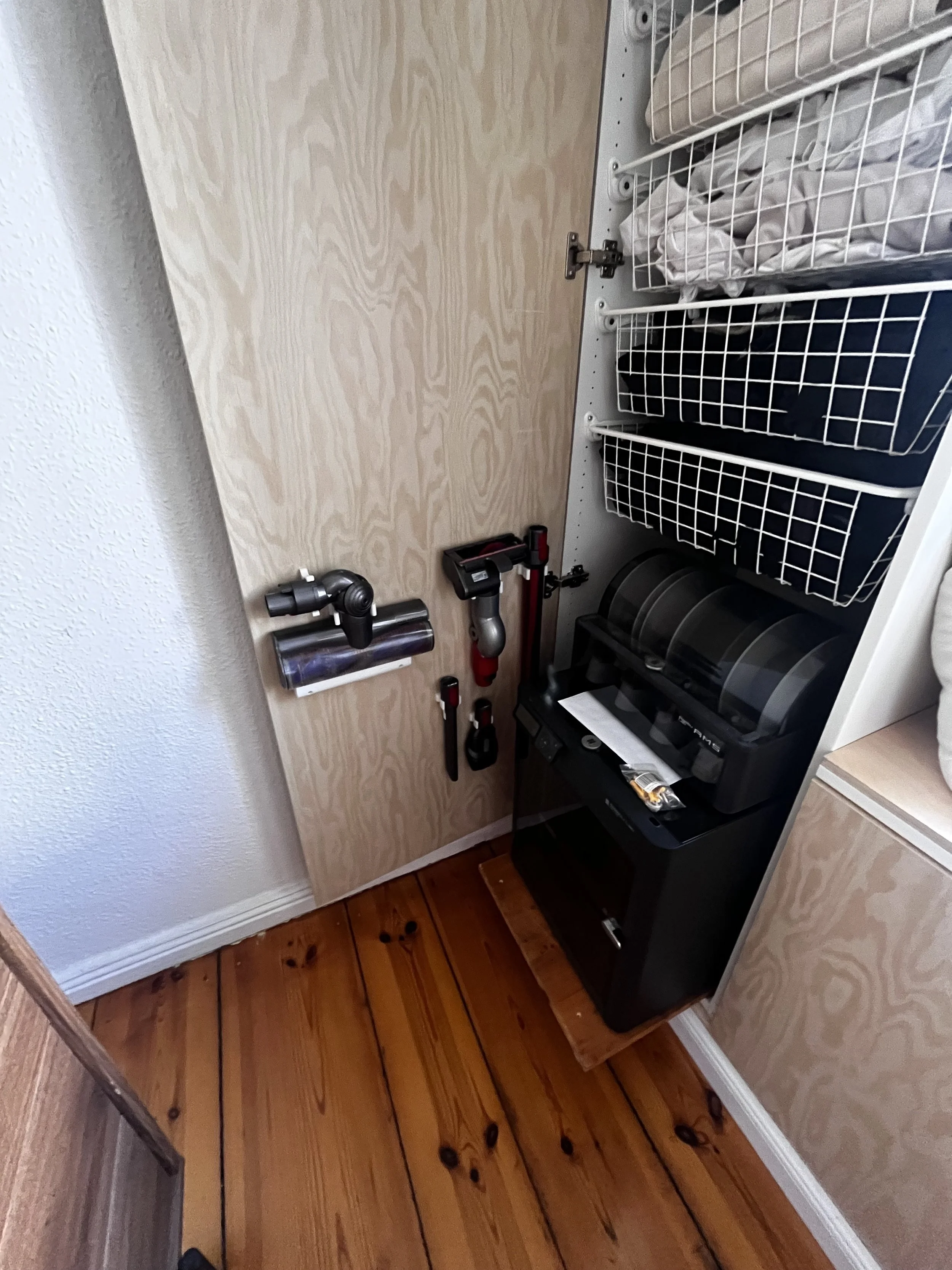 For my apartment, I designed a custom-built cabinet that integrates seamlessly into the space. The pedestal with baseboard creates a clean line, while a cozy seating nook with two wall lights and hidden cable routing adds extra comfort. Inside, it conceals a self-designed holder for the vacuum cleaner as well as a movable platform for a 3D printer, which can be pulled out when needed. Functionality and living aesthetics blend seamlessly here.
