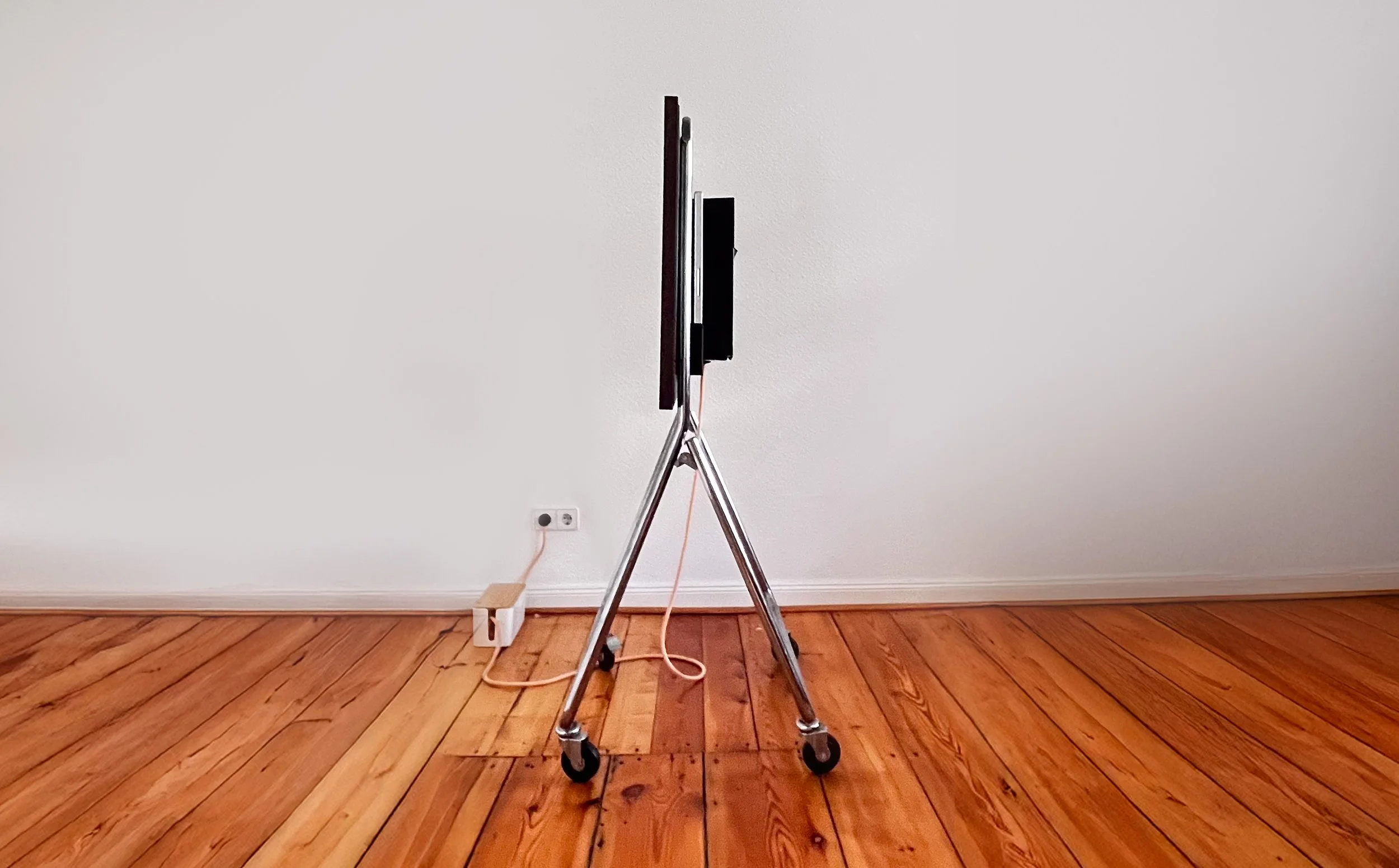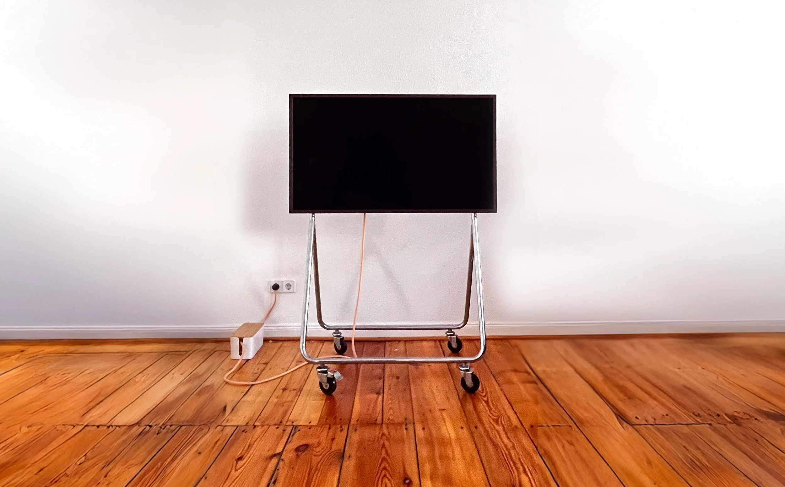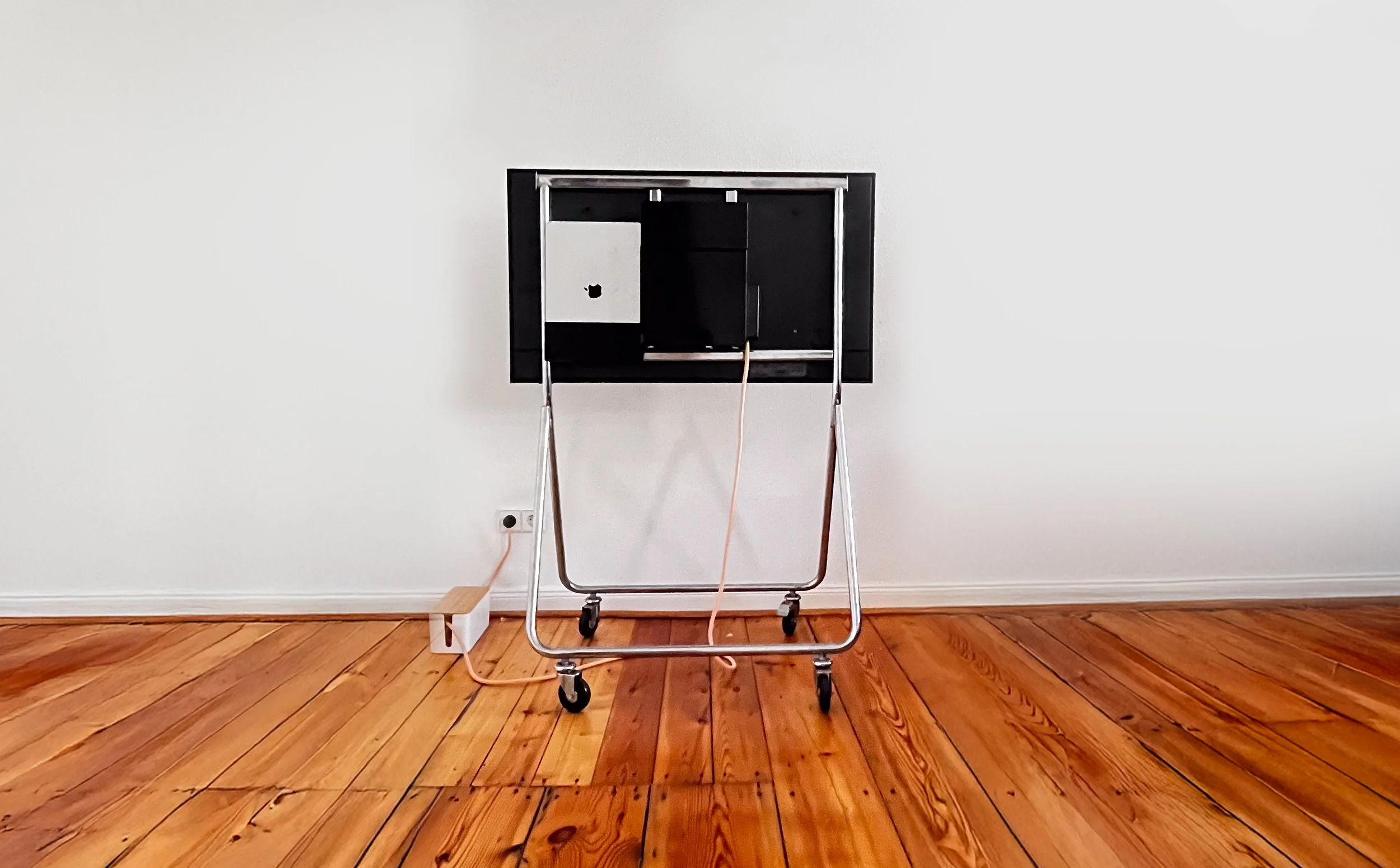 From an old clothes rack and a mailbox, a flexible TV stand was created that combines living, working, and entertainment. The TV is mobile on wheels, also serving as a 4K monitor for the home office, and thanks to smart cable management, storage space, and a custom-developed MacBook holder, it integrates an invisible multimedia solution. The striking orange textile cable turns a necessity into a deliberate design element.